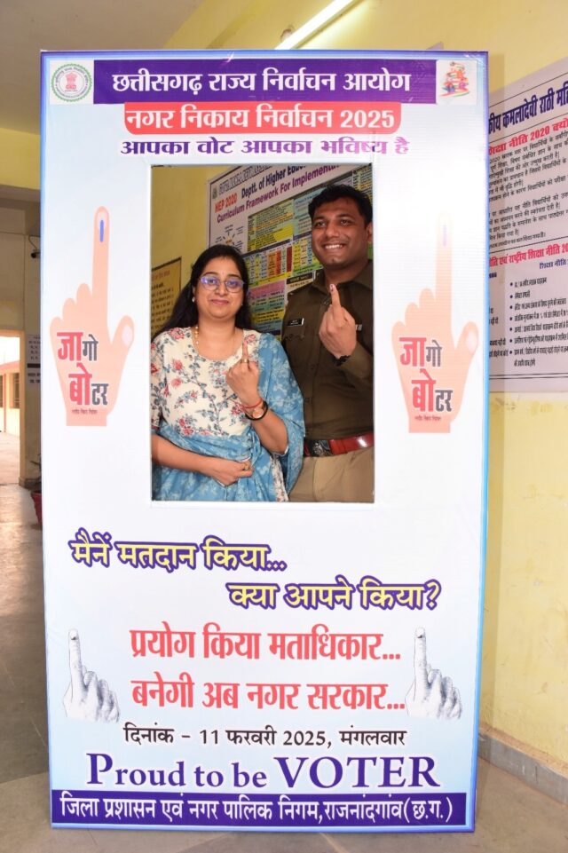राजनांदगांव 11 फरवरी 2025। पुलिस अधीक्षक श्री मोहित गर्ग ने अपनी पत्नी के साथ शासकीय कमलादेवी कन्या महाविद्यालय दक्षिण भाग मतदान केन्द्र क्रमांक 129 पहुंचकर मतदान किया। इस दौरान पुलिस अधीक्षक श्री मोहित गर्ग ने अपनी पत्नी के साथ मतदान करने के बाद सेल्फी पॉइंट पर सेल्फी लेकर मतदान करने का संदेश दिया।