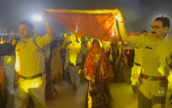 दोपहर 2 बजे बाराती नगर भ्रमण के लिए निकले. इसमें भगवान शिव-पार्वती, मां दुर्गा, मां काली की झांकी देखने को मिली. बारात में दूल्हा-दुल्हन को गाड़ी में बिठाकर नगर भ्रमण कराया गया. वर-वधू को आशीर्वाद देने चार हजार से भी अधिक शहरवासी, पुलिस परिवार और संस्थान के सदस्य शामिल हुए. लोगों ने बेड, वॉशिंग मशीन, कूलर, बर्तन, कपड़े, गृहस्थी जीवन में उपयोगी वस्तुओं को उपहार स्वरूप दिया.