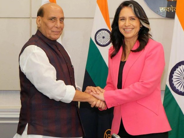 अमेरिकी राष्ट्रीय खुफिया निदेशक तुलसी गबर्ड ने सोमवार को रक्षा मंत्री राजनाथ सिंह से मुलाकात की. इस दौरान दोनों ने भारत और अमेरिका के बीच रक्षा और सुरक्षा संबंधों को मजबूत करने पर चर्चा की. गबर्ड इस समय ढाई दिवसीय भारत दौरे पर हैं. राजनाथ सिंह और गबर्ड के बीच बैठक में रक्षा और सुरक्षा संबंधों को बढ़ावा देने के तरीके पर चर्चा हुई. इस बीच तुलसी गबर्ड ने एनडीटीवी से बातचीत में कहा कि प्रधानमंत्री नरेंद्र मोदी और राष्ट्रपति डोनाल्ड ट्रंप साझा लक्ष्यों पर ध्यान केंद्रित कर रहे हैं. गबर्ड ने बताया कि दोनों नेता ‘बहुत अच्छे दोस्त हैं’ और उन्होंने पिछले महीने वॉशिंगटन डीसी में एक शानदार बैठक की थी.