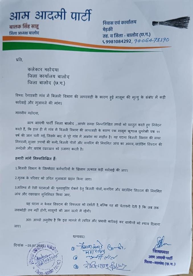 आम आदमी पार्टी जिलाध्यक्ष बालक साहू ने इस दुखद घटना पर गहरा दुख व्यक्त करते हुए बताया कि हाल ही में गांव में बिजली विभाग की लापरवाही के कारण एक मासूम की जान चली गई, जिसके बाद से पूरे गांव में आक्रोश का माहौल है। उन्होंने जोर देकर कहा कि यह घटना बिजली विभाग की लचर निगरानी, खुले और असुरक्षित बिजली के तारों की अनदेखी, सुरक्षा उपायों की घोर कमी, बिजली पोलों और वायरिंग की नियमित जांच का अभाव, ग्राउंडिंग सिस्टम की अनदेखी, और खराब रखरखाव को स्पष्ट रूप से उजागर करती है। यह सीधे तौर पर विभागीय अधिकारियों की कर्तव्यहीनता का परिणाम है।