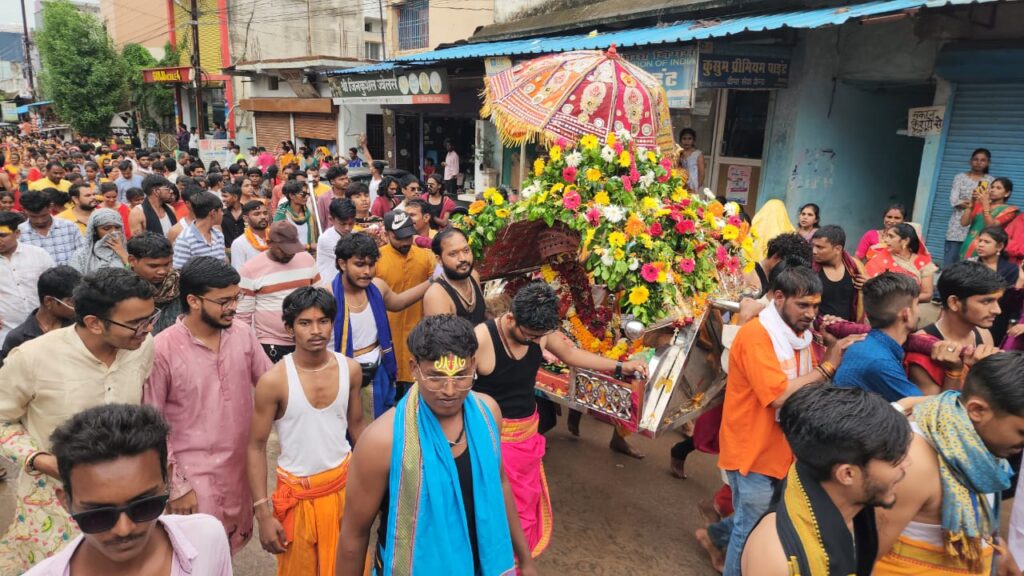 शहर के ढाबा वार्ड से बाबा महाकाल की पूजा-अर्चना, शंखनाद एवं पूष्प वर्षा के बाद धूमधाम के साथ रवाना हुई। उक्त पालकी यात्रा का शिवनगर, चिखली पहुंचने पर श्रद्धालु जनों द्वारा जगह-जगह पूजा अर्चना की गई, वहीं महिलाएं द्वारा थाल सजाकर कर भगवान श्री चंद्रमौलेश्वर की आरती की गई। महाकाल पालकी यात्रा के आगे बढऩे पर स्टेशन पारा से लेकर गौरीनगर तक लोगों ने बाबा महाकाल की पालकी यात्रा के लिए पलक पांवड़े बिछाए रहे और वहां पहुंचने पर बाबा महाकाल की पूजा आरती की वहीं पालकी यात्रा में शामिल श्रद्धालुओं का मीठा पेय, चाकलेट, स्वल्पाहार आदि से स्वागत किया गया। इस दौरान महाकाल सेना के पवन डागा, राजू डागा, पूर्व महापौर अजीत जैन, अमित खंडेलवाल, संजय तेजवानी, आलोक बिंदल, दामू भूतड़ा, मनीष खंडेलवाल, ओम बाबा जी, अनूप श्रीवास आदि सहित बड़ी संख्या में महाकाल भक्त युवक-युवतियां व महिलाएं बच्चे उपस्थित थे।