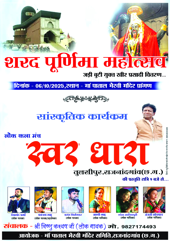 राजनांदगांव (दावा)। प्रत्येक वर्ष की भांति इस वर्ष भी संस्कारधानी राजनांदगांव की पहचान मां पाताल भैरवी मंदिर में जड़ी बूटी युक्त खीर प्रसादी का वितरण होगा। जिसमें रात भर दर्शकों के भक्ति भाव के साथ मनोरंजन के लिए छत्तीसगढ़ के मशहूर कलाकारों की प्रस्तुति छत्तीसगढ़ी सांस्कृतिक लोक कला मंच स्वरधारा का आयोजन होगा। इसके आयोजक मां पाताल भैरवी मंदिर समिति है।
