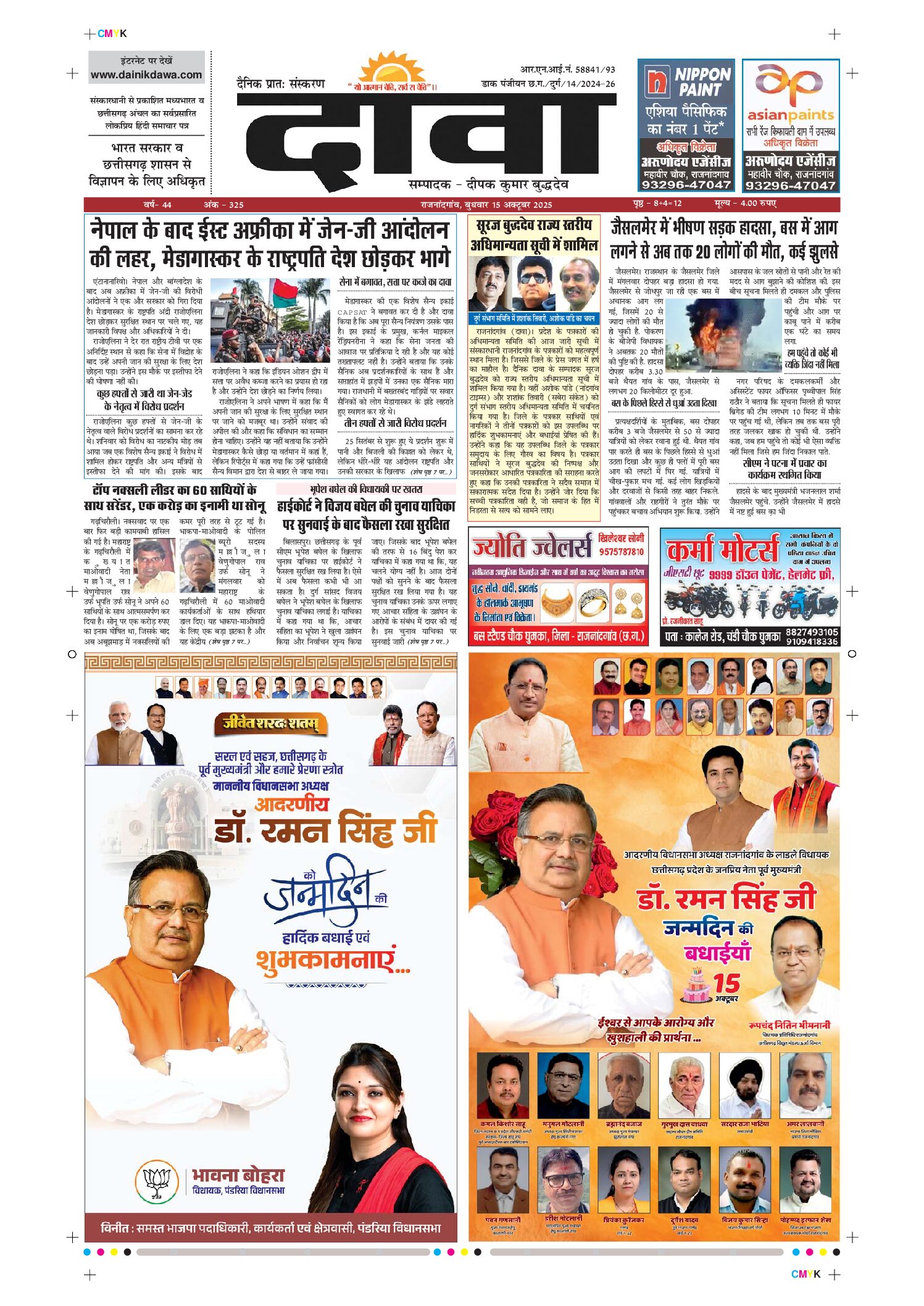 Home छत्तीसगढ़ दैनिक दावा ई पेपर 15-10-25 छत्तीसगढ़समाचारहोम दैनिक दावा ई पेपर 15-10-25 By SURAJ BUDHHDEV - October 15, 2025 42 0 FacebookTwitterPinterestWhatsApp 20251015