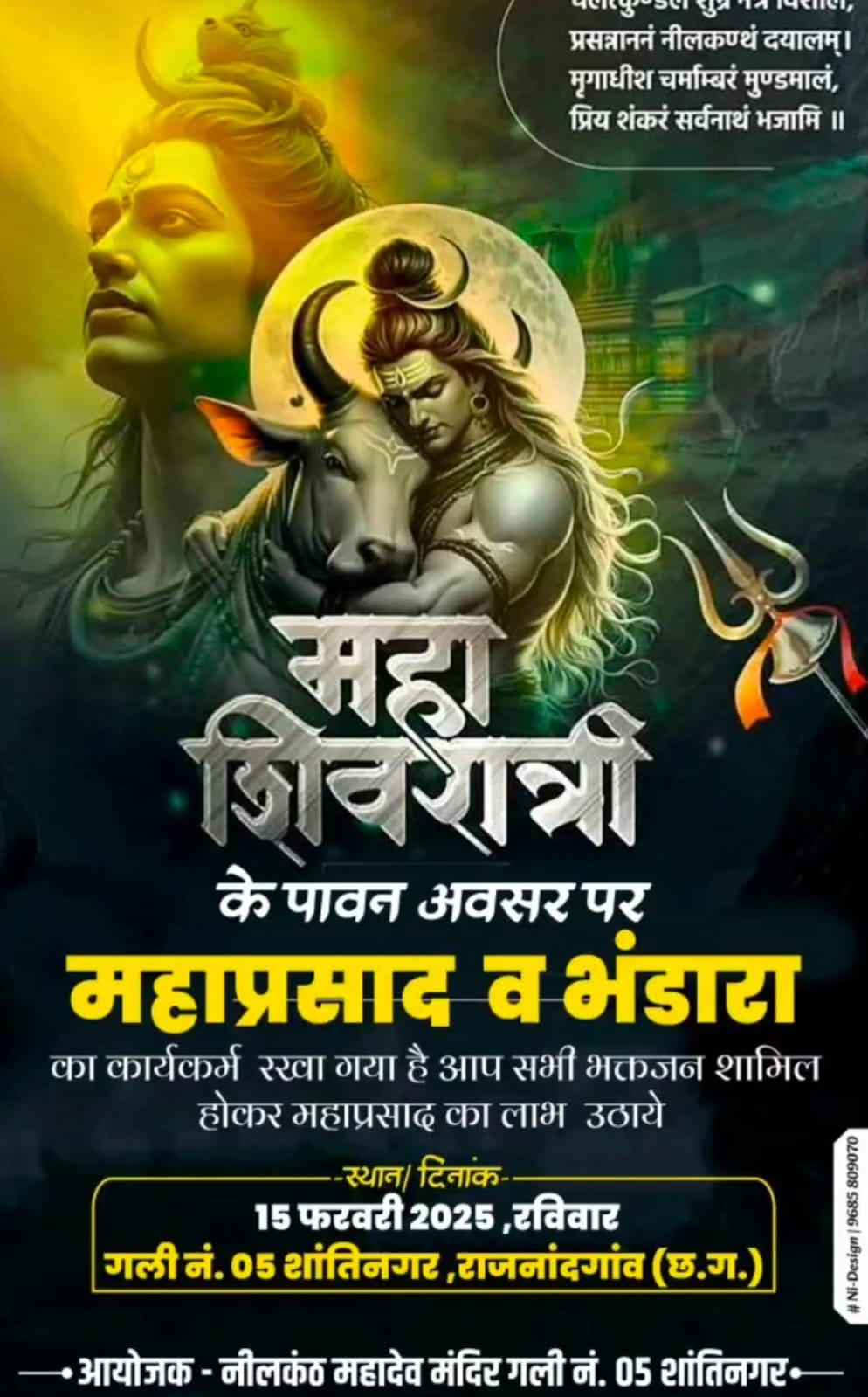 राजनांदगांव / शहर के पटरी पार इलाका शांति नगर में महाशिवरात्रि पर्व धूमधाम के साथ मनाया जाएगा। इसके लिए मंदिर समिति द्वारा भव्य तैयारियां की जा रही है। समिति के विरेंद्र रजक ने बताया कि नीलकंठ महादेव मंदिर गली नंबर 5 शांति नगर में 15 फरवरी को महाशिवरात्रि पर्व के अवसर पर देवो में देव भगवान शिव शंकर की पूजा-अर्चना , दुग्धाभिषेक, रुद्राभिषेक आदि सहित भजन- पूजन का कार्यक्रम आयोजित किया गया है। तत्पश्चात भंडारा महाप्रसादी का आयोजन किया गया है। मंदिर समिति द्वारा महाशिवरात्रि पर्व पर आयोजित उक्त कार्यक्रम में लोगों को अधिकाधिक संख्या में सम्मिलित होकर भगवान शिव की कृपा प्रसादी पाने के लिए अपील की गई है